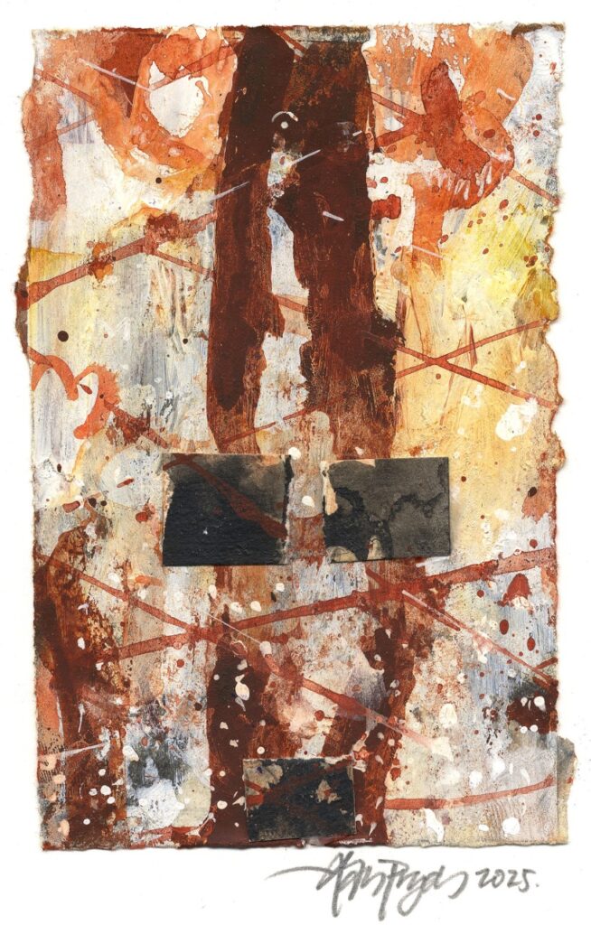 Acryl, tusch, blyant og collage på papir, 15 × 9,5 cm.