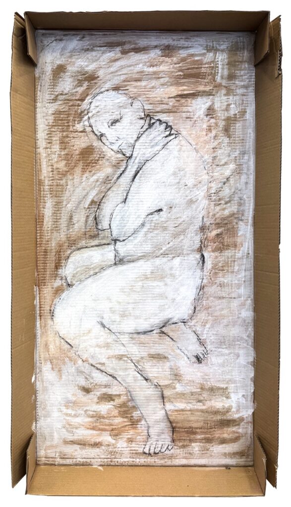 Tegning, blyants, gesso og akryl på emballagepap.