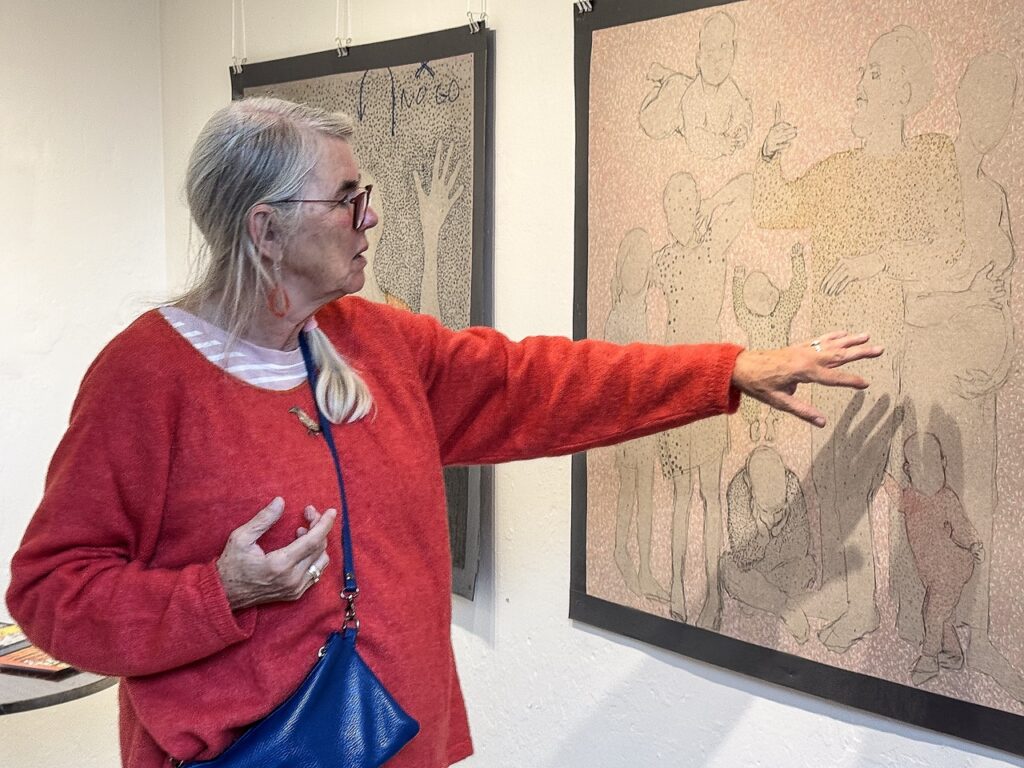 Stinne Møller-Hansen fortæller om sine tegninger på gulvpap. Foto: Lars Pryds