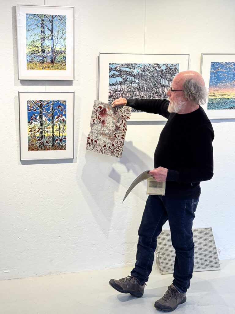 Claudio Bannwart fortæller om linoleumstrykkets teknik. Foto: Lars Pryds
